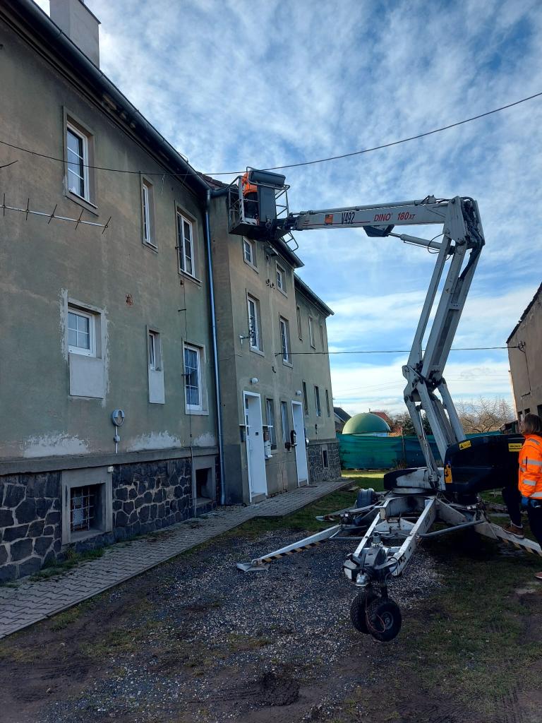 Pracovníci obce provádí čištění okapů na obecních budovách bytů.