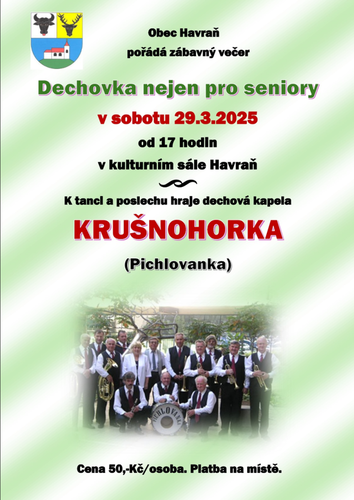 Dechovka nejen pro seniory v sobotu 29.3.2025 od 17:00 hod. v kulturním sále Havraň k tanci a poslechu hraje dechová kapela Krušnohorka (Pichlovanka)