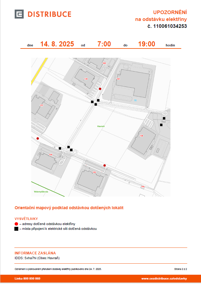 ČEZ - odstávka elektřiny dne 14.8.2025 od 7:00 hod. do 19:00 hod. 2